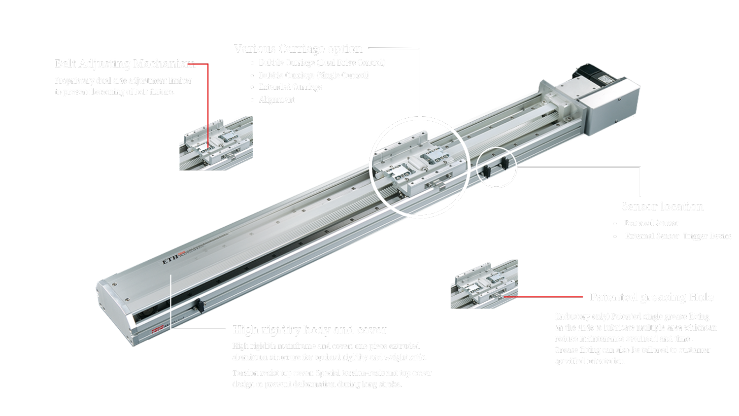 Toyo’s belt-type electric actuator is a specific type of linear motion system that employs an electric motor to drive a belt mechanism, facilitating linear movement. The actuator is powered by an electric motor to generate rotational motion. The Motor connects to a belt mechanism, belt is looped around pulleys or rollers, with one end connected to the motor shaft and the other attached to the load or carriage that needs to be moved linearly. When the motor rotates, it drives the belt, causing it to move along the pulleys or rollers. This movement is then transferred to the load, resulting in linear motion.